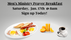 Men’s Prayer Breakfast: Saturday, Jan. 17th @ 8am, there will be a Men’s Ministry Prayer Breakfast. This is a wonderful time for the men to come together and fellowship with one another. Bring a friend or family member with you & come enjoy some great food! There is a sign up sheet located in the church foyer, please sign up so we have an idea of how much food should be prepared. See you there!